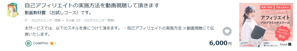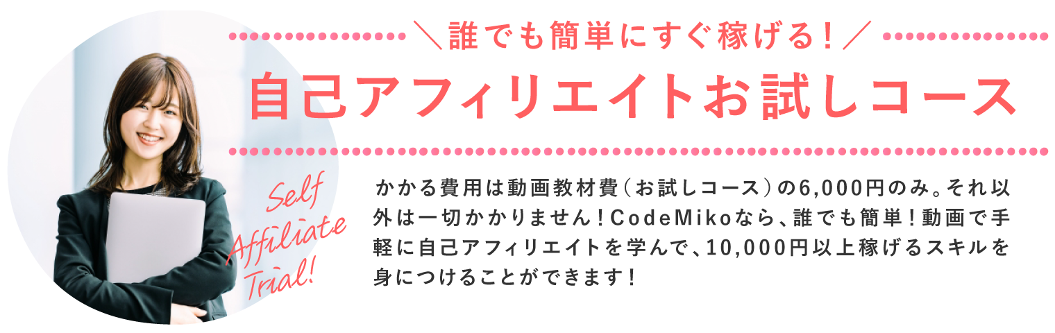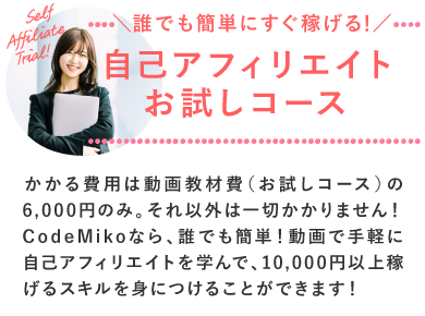 自己アフィリエイトお試しコース 2024.02.272024.03.08 ※クリックすると、ココナラページへ移動します。 かかる費用はなんと動画教材費(お試しコース) 6,000円だけ!※上記以外、入塾費等はかかりません! 自己アフィリエイトで10,000円以上が簡単にすぐ稼げるように! かかる費用はなんと動画教材費(お試しコース)6,000円(税込)だけ!上記以外は一切かかりません! 自己アフィリエイトで10,000円以上が簡単にすぐ稼げるように! 自己アフィリエイトとは、アフィリエイトで紹介できる「商品」や「サービス」を自分で購入して報酬を得る仕組みのこと。講義動画では、自己アフィリエイトのやり方を分かりやすく解説しているから、繰り返し視聴することで、誰でも簡単に自己アフィリエイトを学ぶことができます。 自己アフィリエイトおすすめ案件ご紹介(10,000円以上) ご自身で商品やサービスを申し込みアフィリエイト報酬を 受け取る「自己アフィリエイト」のおすすめ商品やサービスを ご紹介します! 自己アフィリエイトおすすめ案件ご紹介(10,000円以上) ご自身で商品やサービスを申し込みアフィリエイト報酬を受け取る「自己アフィリエイト」のおすすめ商品やサービスをご紹介します! 当スクールは、ココナラを使用したお申し込み・お支払い方法を採用しております また、スクールに関するやりとりはすべてココナラ内でおこなっております 以下のバナーをクリックして、ココナラへアクセス。キーワード検索から「CodeMiko」を検索してください。 下記の動画教材費(お試しコース)出品ページにアクセスし、ご購入にお進みください。 動画教材費(お試しコース) 出品ページ ↓↓ご購入は以下をクリック↓↓ 下記の動画教材費(お試しコース)出品ページにアクセスし、ご購入にお進みください。 動画教材費(お試しコース) 出品ページ これまでは終身雇用が当たり前でしたが、生きるために求められる能力やマインドセットは大きく変化しています。これからは自分自身が望む「生き方」「働き方」を実現していく時代です。「CodeMiko」は、今の自分を変えようという決意のもと、新たな第一歩を踏み出そうとしている方々を全力でサポートします。一人でも多くの方が、自立して資金を稼げるスキルを学び、仕事に縛られない自由な時間を獲得する。そうすることで、皆が新しいことに挑戦し活気あふれた世界になることを目指しています。 パソコンさえあれば、どこでも誰でもアフィリエイトを始められます。他のスクールでは入塾費・授業料など多額の費用がかかりますが、当スクールでは入塾料もなく動画教材費も安価。さらに、すぐに自己アフィリエイトを始めてもらうためのプレゼントもご用意しています。 当スクールでは、学習教材として講義動画をご用意しています。好きな時間に繰り返し動画を視聴することができますので、講義内容の理解をより深められるのはもちろん、ご自身の好きなタイミングで自己アフィリエイトを学び、実施することができます。 当スクールの講義動画は、自己アフィリエイト実施に必要なポイントを絞って丁寧に解説しています。大事なところだけを動画で効率的に学習することができるので、短期間で稼ぐために必要なスキルの習得を目指すことができます。 動画教材費(お試しコース) お試しコース価格 6,000 円 ※上記以外の入塾費等はかかりません! お申込み後は、お試しコース用ページにもアクセス可能になり、講義動画は見放題にご自身の好きな時間に繰り返し動画を視聴して学習することができます スクールへの申し込み ココナラの出品ページから「動画教材費(お試しコース)」を購入していただきます。 ※お申し込み後は、すべてココナラ内でやりとりさせていただきます。 お試しコース用ページのパスワードお渡し スクールでココナラ出品ページご購入を確認したあと、お試しコース用ページのパスワードをお渡しします。この専用ページから講義動画が視聴できるようになります。 ※パスワードは他人に教えないようにしてください。 講義動画を視聴しながら自己アフィリエイト実施 お試しコース用ページへアクセスし、講義動画を視聴します。動画はお好きな時間に繰り返しご覧いただくことができます。動画をご覧いただきながら、実際に操作して自己アフィリエイトを実施していきます。 アンケートの回答 動画を視聴、自己アフィリエイトを実践したら、アンケートに回答いただきます。 これまでは終身雇用が当たり前でしたが、生きるために求められる能力やマインドセットは大きく変化しています。これからは自分自身が望む「生き方」「働き方」を実現していく時代です。「CodeMiko」は、今の自分を変えようという決意のもと、新たな第一歩を踏み出そうとしている方々を全力でサポートします。一人でも多くの方が、自立して資金を稼げるスキルを学び、仕事に縛られない自由な時間を獲得する。そうすることで、皆が新しいことに挑戦し活気あふれた世